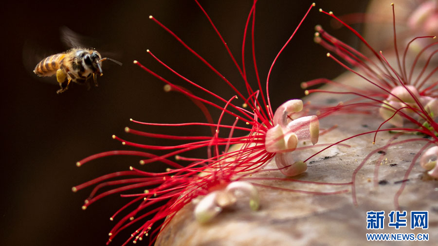 花香漫溢,蜜蜂闻香飞舞而来。新华网发(黄巧珠 摄)