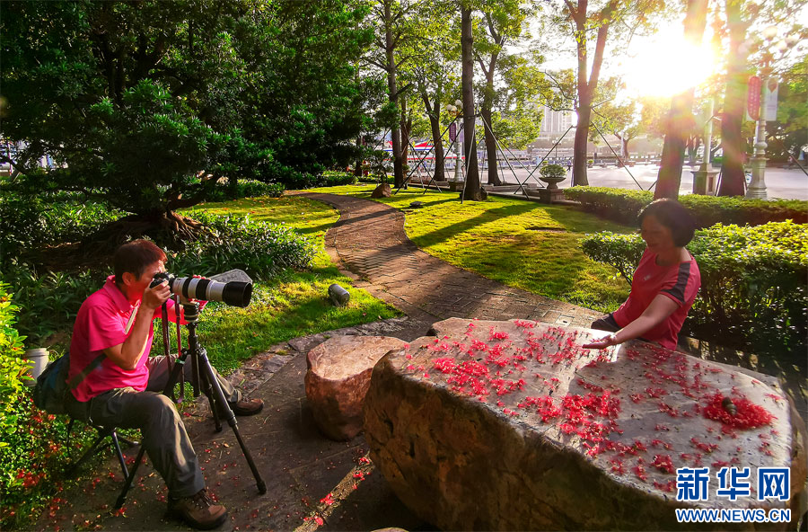 日落时分,伴随着余晖霞光,红色的玉蕊花瓣散落在石头桌面上,别样的美丽。新华网发(卢景其 摄)