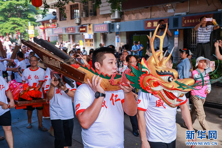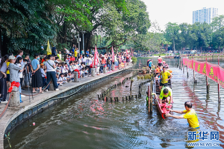 荔枝湾畔人潮如织、锣鼓喧天,泮塘村民欢聚于此,沿袭起龙仪式,宣告龙船季的开启。新华网发(张朝竣 摄)