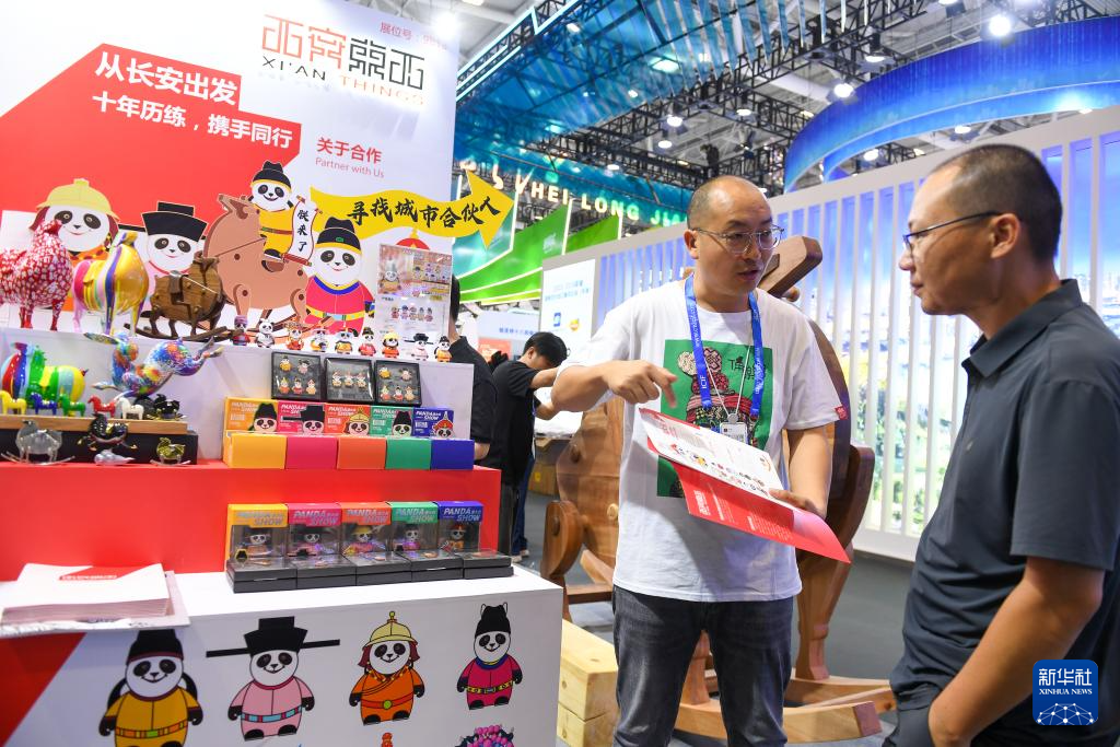 5月23日,参展商在第二十届文博会上向参观者介绍文创产品。新华社记者 毛思倩 摄