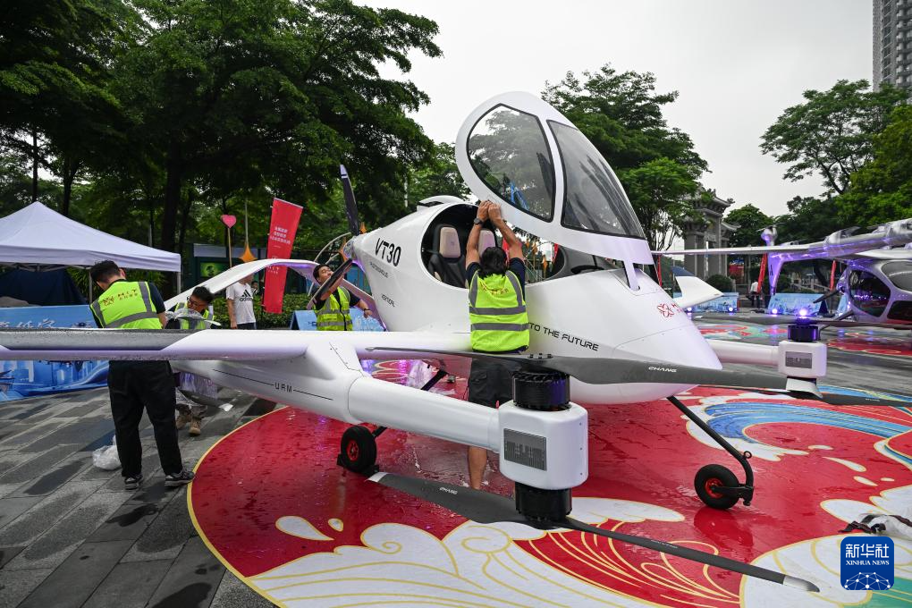 6月3日,工程师打开亿航智能VT-30无人驾驶载人航空器座舱盖,供观众参观体验。新华社记者 刘大伟 摄