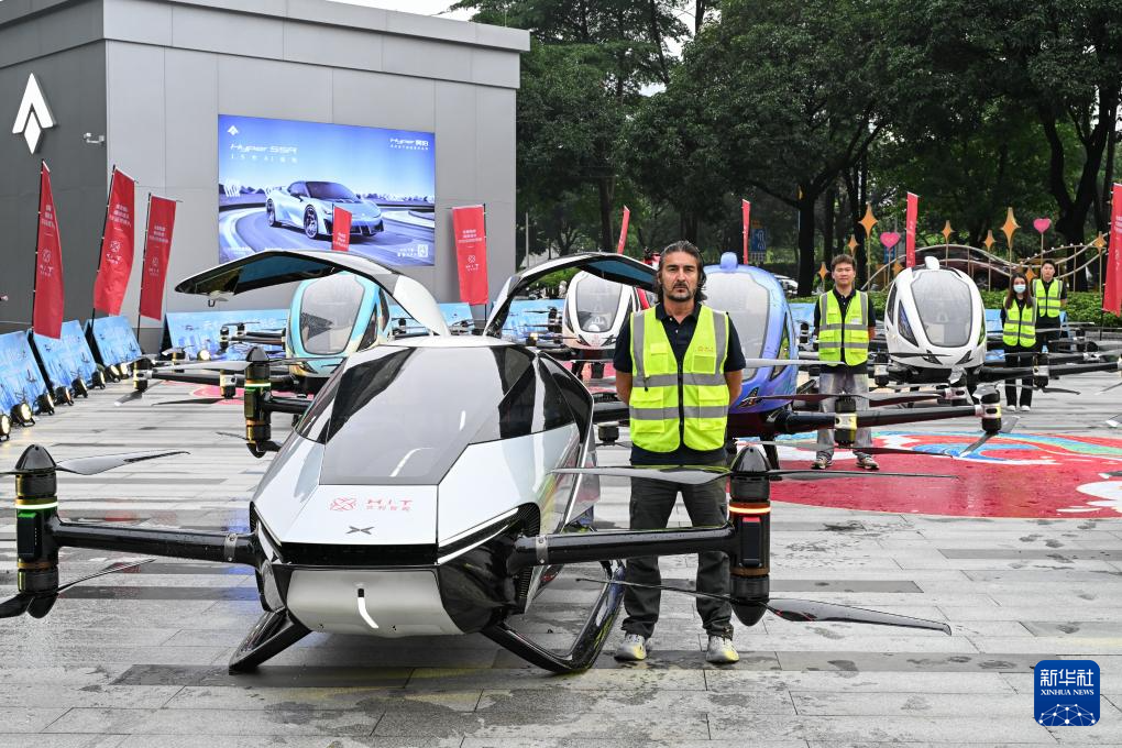 6月3日,广州低空航展上,eVTOL综合运营服务商合利智能的工程师团队和他们运营服务的机型。新华社记者 刘大伟 摄