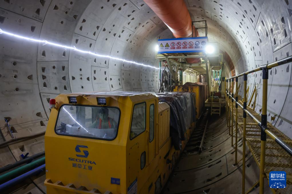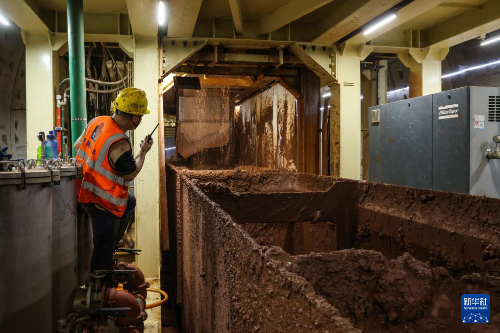 7月18日,泥水渣土运输车在隧道内接收盾构机输出的盾构弃渣。新华社记者 刘大伟 摄