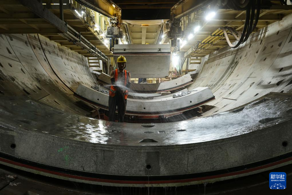 7月18日,施工人员在管片拼装前使用净化处理水冲洗隧道管片,由此产生的施工污水仍将被净化后再利用。新华社记者 刘大伟 摄