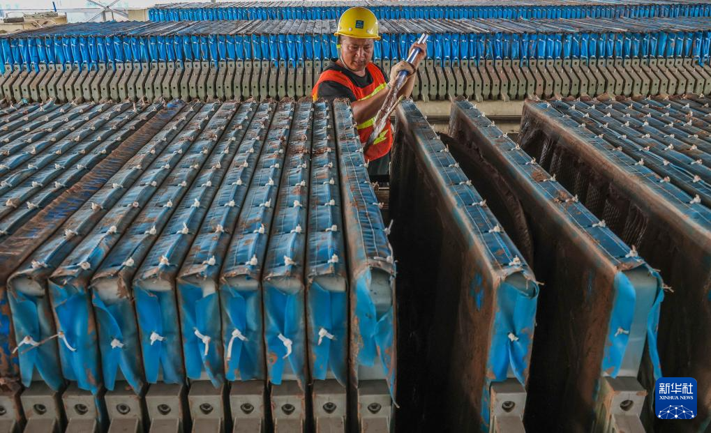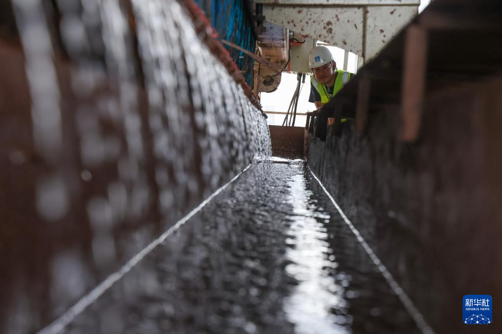7月18日,施工人员在芳白城际六工区污水处理厂泥水压滤产线清理污水压滤后产生的泥饼。新华社记者 刘大伟 摄