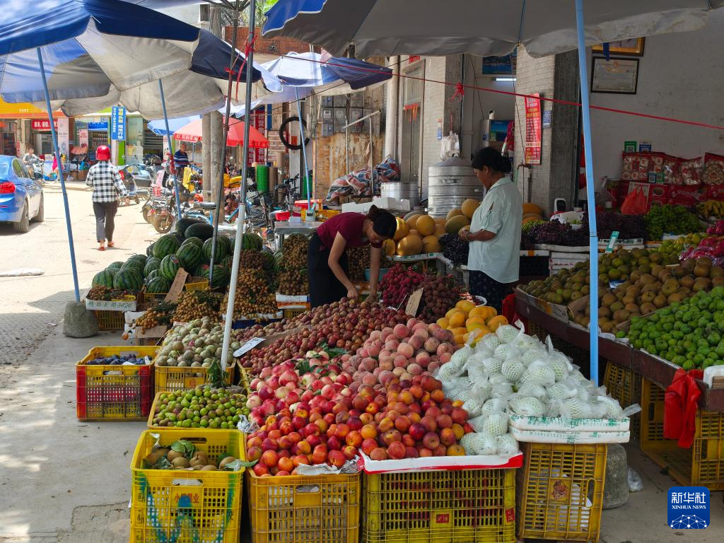 在怀集县中洲镇的农贸市场上,商贩正在售卖猪肉、水果等。街边的小店重整一新,不少村民正购买日用品和农副产品,街上车来车往,一派热闹景象。