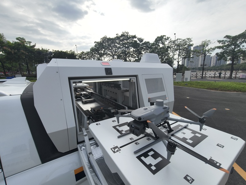依托专属智能应用平台,该系统实现了无人机远程操控起降与异地部署的全流程自动化:指挥中心通过可视化调度系统下发任务并实时监控,无人机起飞后可根据载体车辆动态位置自动规划返航路径,构建起“车机协同、智能调度”的全新作业模式。