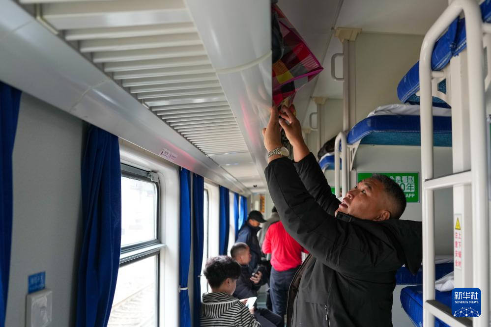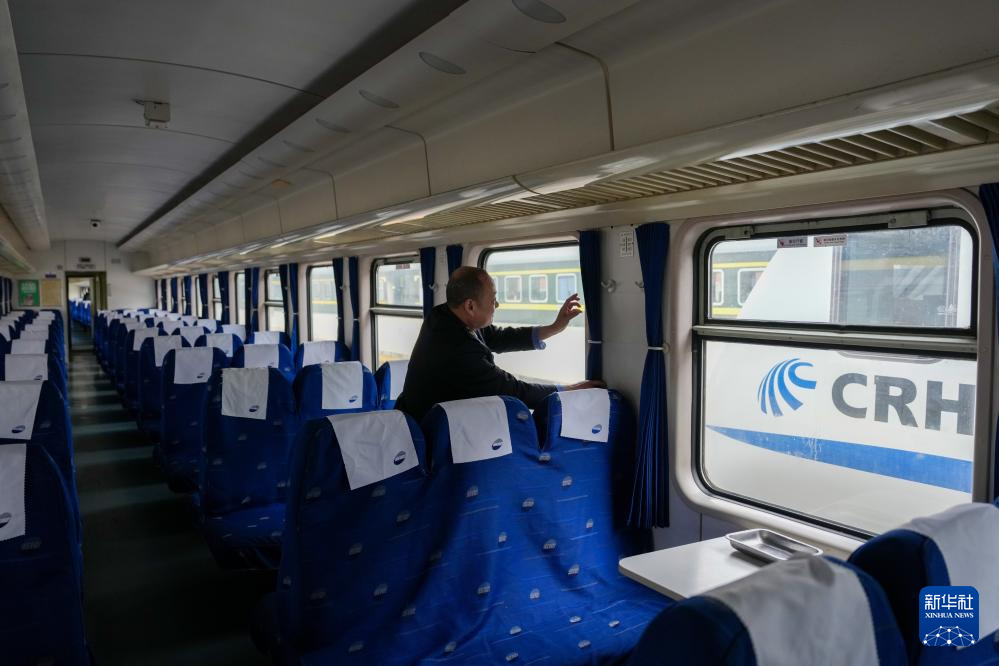 1月25日,K303次列车的列车员在车厢里做发车前准备。