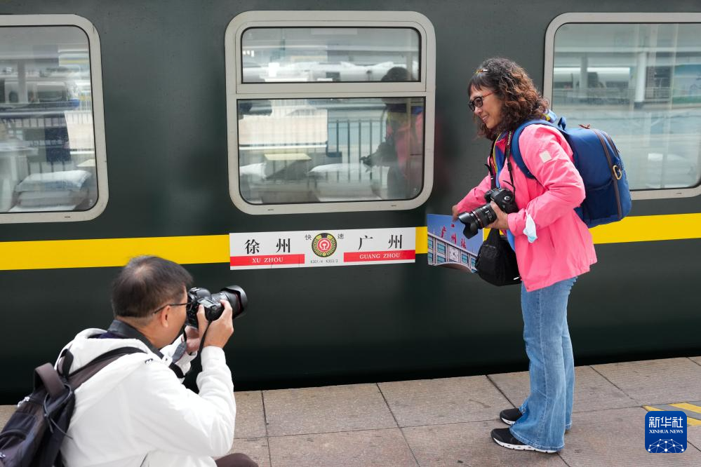 1月25日,在广州火车站,市民在K303次列车旁拍照留念。
