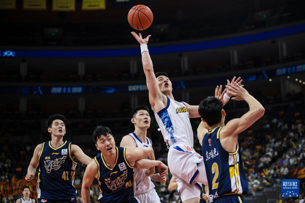 4月4日,浙江政商证券队球员胡金秋(中)在比赛中上篮。新华社发(郑家雄摄)
