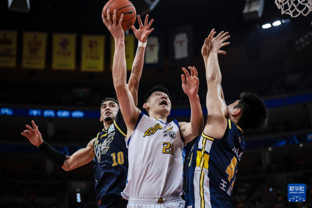 4月4日,广东东阳光队球员王少杰(中)在比赛中拼抢。新华社发(郑家雄摄)