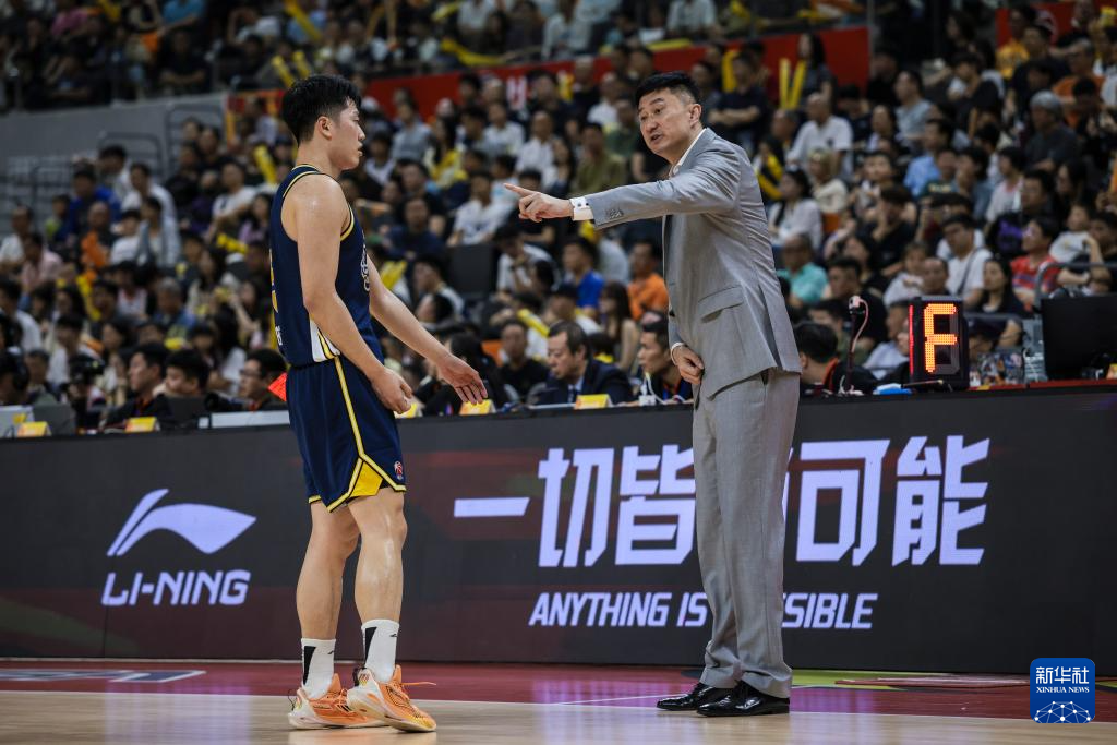 4月4日,广东东阳光队主教练杜锋(右)在比赛中与张皓嘉交流。新华社发(郑家雄摄)
