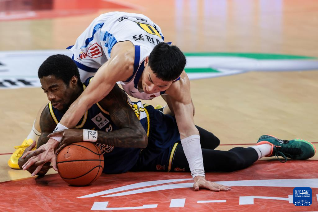 4月4日,广东东阳光队球员萨姆纳(下)与浙江浙商证劵队球员林秉圣在比赛中拼抢球。新华社发(郑家雄摄)