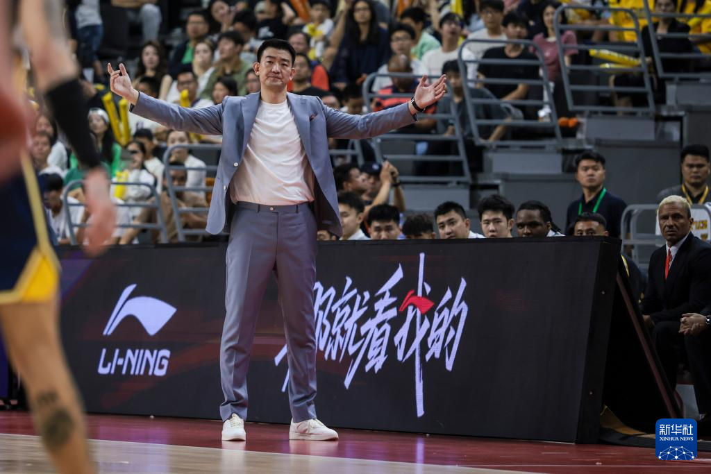 4月4日,浙江政商证券队主教练王博在场边观战。新华社发(郑家雄摄)